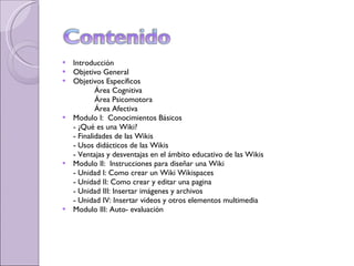 Este documento presenta una guía para crear una Wiki educativa. Explica qué es una Wiki, sus usos didácticos y ventajas/desventajas. Luego, provee instrucciones detalladas para crear una cuenta en Wikispaces, diseñar páginas, agregar contenido, imágenes y videos. El objetivo es capacitar a estudiantes para que creen de manera autodidacta su propia Wiki y aprendan a utilizar esta herramienta.