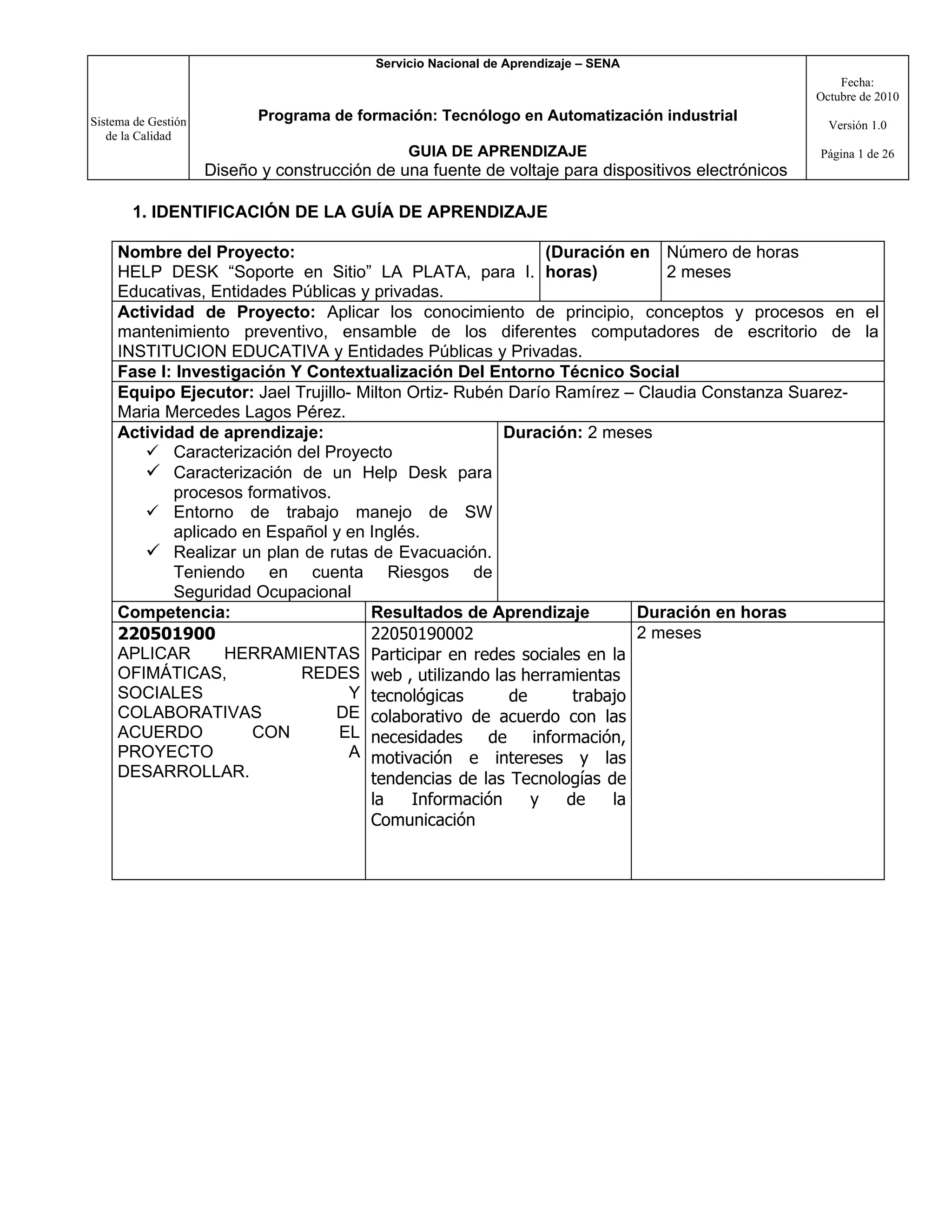Este documento presenta una guía de aprendizaje para un proyecto de formación profesional sobre la implementación de un servicio técnico de soporte informático. La guía describe los objetivos del proyecto, las competencias a desarrollar, y las actividades de aprendizaje requeridas como instalar una herramienta de soporte técnico, utilizar redes sociales y bases de datos, y proporcionar soporte técnico a usuarios. La guía también explica conceptos clave como características de un servicio de soporte técnico y funciones