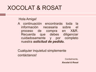 Este documento proporciona instrucciones sobre cómo realizar un pedido en Xocolat & Rosat. Indica que se debe completar cuidadosamente la solicitud de pedido proporcionando la información de contacto, dirección de entrega, códigos de referencia de los productos con especificaciones de color, talla y cantidad. También explica las tres opciones de pago disponibles y las políticas de devoluciones y cambios.