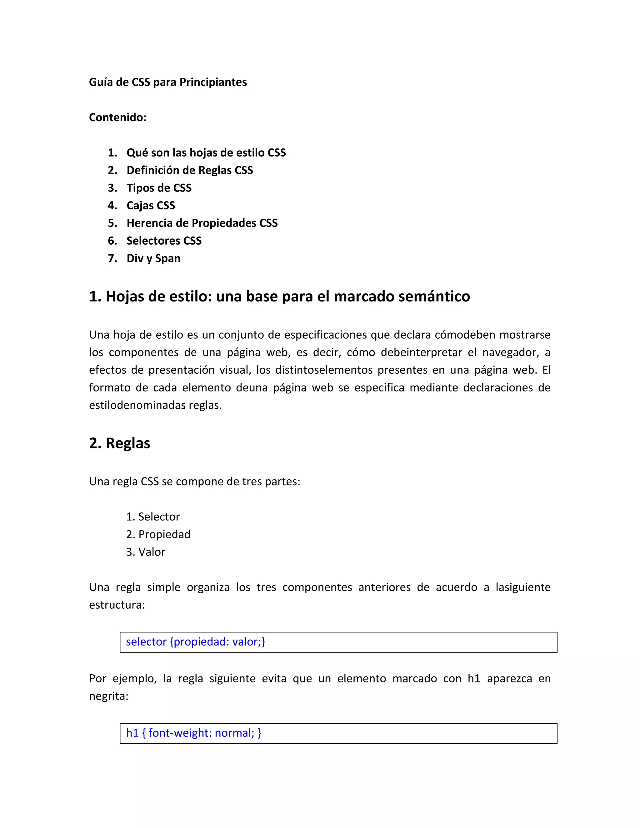 La guía de CSS para principiantes presenta conceptos fundamentales sobre hojas de estilo, incluyendo su definición, el funcionamiento de las reglas CSS, tipos de selectores, y conceptos de cajas y herencia. También explica cómo aplicar estilos a través de diferentes métodos, así como el uso de los elementos div y span para estructurar el contenido. Se enfatiza la importancia de separar el contenido de la presentación para lograr una codificación semántica efectiva.