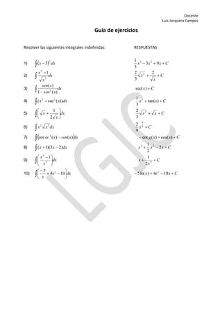 Este documento presenta 10 integrales indefinidas para resolver. Cada integral incluye una expresión matemática a integrar y la respuesta de la integral en términos de una constante de integración.