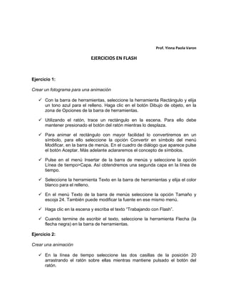 Este documento presenta una guía de 14 ejercicios para trabajar con Flash que incluyen la creación de fotogramas, símbolos, botones animados, máscaras en movimiento y más. Los ejercicios guían al usuario paso a paso para dibujar formas, agregar texto, aplicar efectos como la transparencia, y crear animaciones simples usando fotogramas clave e interpolación de movimiento entre capas.