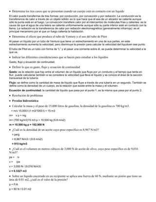 La guía de estudio resume los conceptos clave de la hidrostática y la hidrodinámica, incluidas sus definiciones y aplicaciones. Explica conceptos como peso específico, presión, densidad y volumen. También describe las características de los líquidos como viscosidad y tensión superficial. Finalmente, presenta principios como los de Pascal, Torricelli y Bernoulli, así como definiciones de presión atmosférica y casos de cuerpos en contacto con líquidos. Resuelve varios problemas relacionados con estos conceptos.