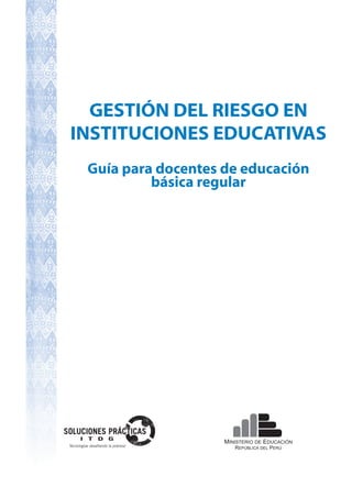 Este documento presenta una guía para docentes sobre la gestión del riesgo en instituciones educativas. Explica conceptos clave como desastres, amenazas, vulnerabilidad y riesgos. Describe los tres enfoques de la gestión del riesgo: correctivo, prospectivo y reactivo. Resalta que las instituciones educativas deben reconocer su entorno, organizarse, colaborar con la comunidad y evaluarse permanentemente para minimizar riesgos. Además, enfatiza la importancia de incluir la gestión del riesgo en el
