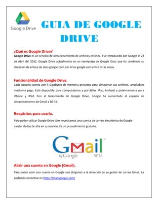 GUIA DE GOOGLE DRIVE ¿Qué es Google Drive? Google Drive es un servicio de almacenamiento de archivos en línea. Fue introducido por Google el 24 de Abril del 2012. Google Drive actualmente es un reemplazo de Google Docs que ha cambiado su dirección de enlace de docs.google.com por drive.google.com entre otras cosas. Funcionalidad de Google Drive. Cada usuario cuenta con 5 Gigabytes de memoria gratuitos para almacenar sus archivos, ampliables mediante pago. Está disponible para computadoras y portátiles Mac, Android y próximamente para iPhone y iPad. Con el lanzamiento de Google Drive, Google ha aumentado el espacio de almacenamiento de Gmail a 10 GB. Requisitos para usarlo. Para poder utilizar Google Drive sólo necesitamos una cuenta de correo electrónico de Google o estar dados de alta en su servicio. Es un procedimiento gratuito. Abrir una cuenta en Google (Gmail). Para poder abrir una cuenta en Google nos dirigimos a la dirección de su gestor de correo Gmail. La podemos encontrar en https://mail.google.com/