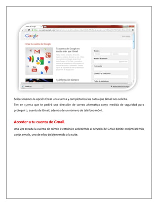 Seleccionamos la opciónCrear una cuenta y completamos los datos que Gmail nos solicita. Ten en cuenta que te pedirá una dirección de correo alternativa como medida de seguridad para proteger tu cuenta de Gmail, además de un número de teléfono móvil. Acceder a tu cuenta de Gmail. Una vez creada la cuenta de correo electrónico accedemos al servicio de Gmail donde encontraremos varios emails, uno de ellos de bienvenida a la suite.