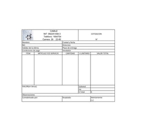 Este documento contiene varios documentos comerciales de una empresa llamada CAMUZ, incluyendo una nota de débito, cotización, pedido, remisión, factura, cheque, letra de cambio y comprobante de pago. Los documentos detallan transacciones comerciales como la venta de joyería.