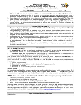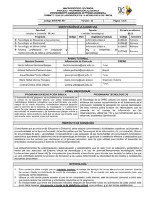 Este documento presenta una guía de aprendizaje para cursos en modalidad a distancia en la Universidad Popular del Cesar (UPTC). Incluye información sobre los programas, asignaturas, docentes, metodología, evaluación y unidades de estudio. La guía busca que los estudiantes adquieran conocimientos y habilidades para aprovechar las herramientas tecnológicas en su aprendizaje autónomo. El documento proporciona instrucciones detalladas sobre el uso de la plataforma virtual y el desarrollo de actividades y