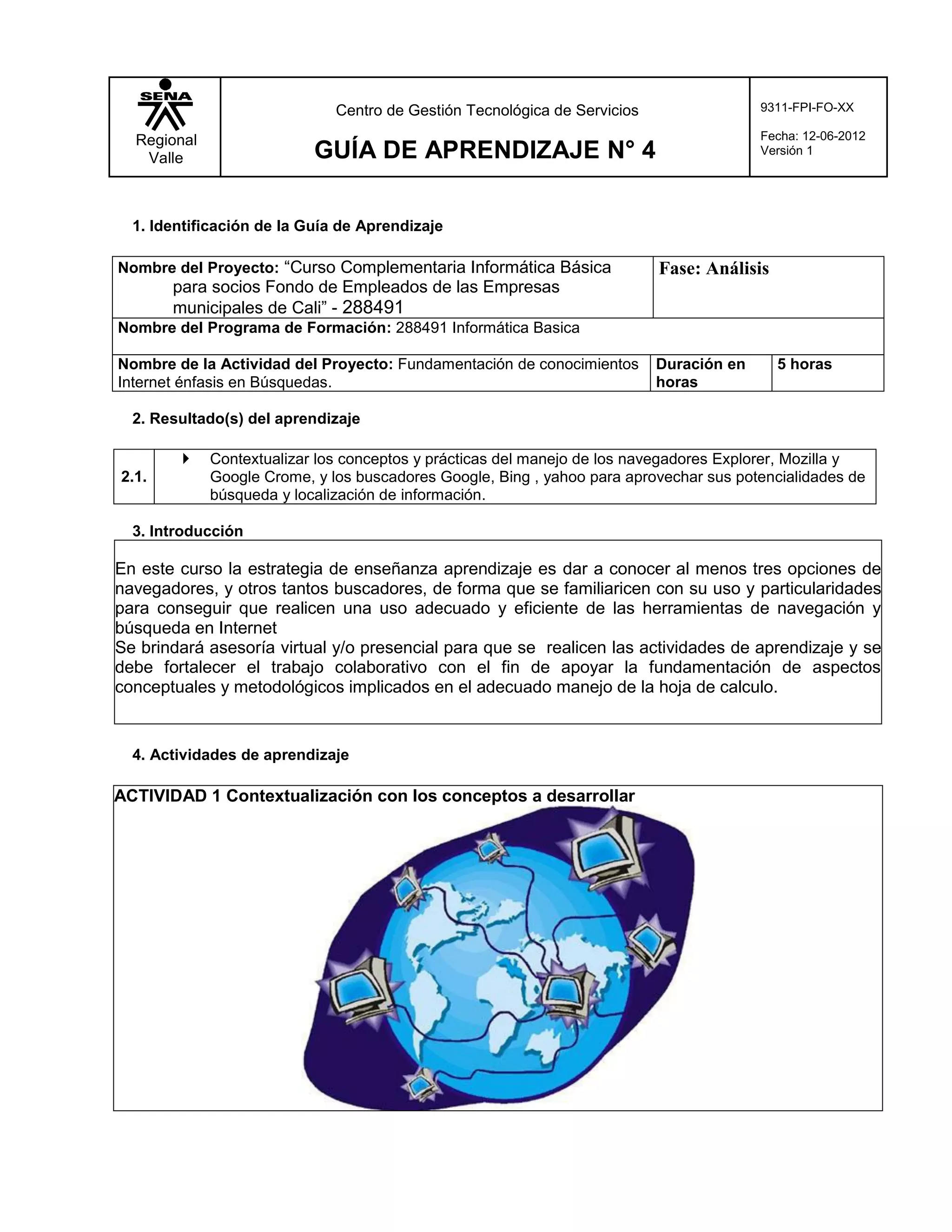 Este documento presenta una guía de aprendizaje sobre el uso de Internet y las herramientas de búsqueda. Explica conceptos clave como navegadores, buscadores, y la web invisible. Describe servicios comunes como correo electrónico y redes sociales. También proporciona detalles sobre plataformas como portales web y motores de búsqueda. Finalmente, ofrece consejos y ejemplos sobre cómo realizar búsquedas efectivas de información en línea.