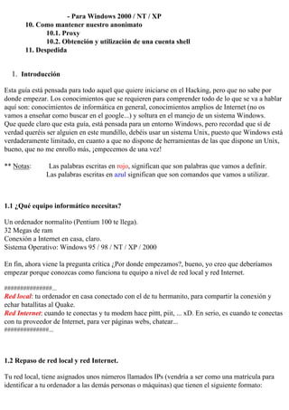 Esta guía ofrece instrucciones para iniciar el hacking en sistemas Windows. Explica los conceptos básicos de red como las IPs, puertos y protocolos. Luego proporciona información sobre comandos de red como ping, netstat y nbtstat para ver el estado de la red y los puertos abiertos. Finalmente, cubre temas como obtener IPs de otros sistemas y herramientas de hacking como troyanos y crackeadores de contraseñas. El objetivo es familiarizar a los lectores con las bases necesarias para explorar más el mundo del hacking