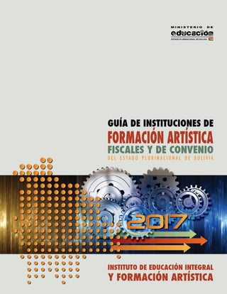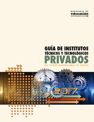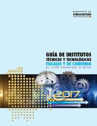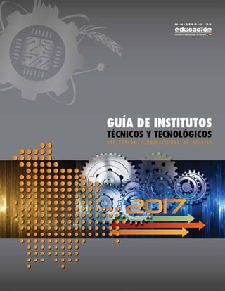 El documento presenta una guía de los institutos técnicos y tecnológicos de Bolivia. Explica que desde 2008, la formación técnica ya no es vista como alternativa sino como profesionalización calificada. Actualmente hay 128 institutos fiscales y de convenio en diversas áreas. El objetivo es articular la formación con los sectores productivos según cada región. La guía lista los institutos del departamento de Chuquisaca con información sobre ubicación, carreras y resoluciones.