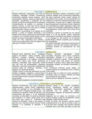 Este documento presenta un cuestionario de 16 factores de personalidad y ofrece una guía para su interpretación cualitativa. Cada factor describe las características de las personas en los polos bajo y alto de cada dimensión. Los factores evalúan rasgos como afabilidad, razonamiento, estabilidad emocional, dominancia, atención a las normas, entre otros. El cuestionario busca determinar la personalidad de una persona a través de estas 16 dimensiones.