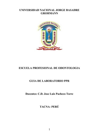 Este documento presenta una guía de prácticas de laboratorio para el curso de Prótesis Parcial Removible de la Escuela de Odontología de la Universidad Nacional Jorge Basadre Grohmann en Tacna, Perú. La guía describe 11 prácticas clínicas que cubren todo el proceso de confección de una prótesis parcial removible, incluyendo impresiones, análisis de modelos, diseño y fabricación de la prótesis. El objetivo es proporcionar a los estudiantes una lista estructurada de los