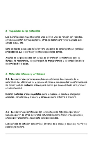 Este documento explora diferentes tipos de materiales, incluyendo metal, vidrio, madera, papel y plástico. Describe cómo se obtienen estos materiales y sus propiedades clave como dureza, resistencia y elasticidad. También distingue entre materiales naturales como madera y minerales versus materiales artificiales como plásticos y vidrio que son fabricados por el ser humano a partir de otros materiales naturales.
