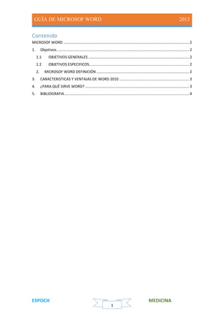 Este documento presenta una guía de Microsoft Word 2013. Explica que Word es un procesador de texto utilizado para crear y editar documentos. Detalla los objetivos generales y específicos de aprender Word, así como sus características, ventajas y usos principales como crear, modificar e imprimir documentos de forma fácil. Finalmente, incluye una bibliografía de recursos sobre Word y procesadores de texto.