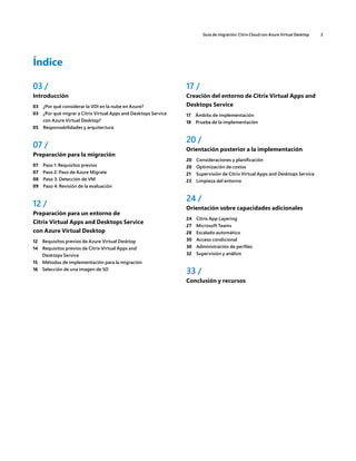 Este documento proporciona orientación sobre cómo migrar una infraestructura de escritorio virtual (VDI) existente hospedada localmente a Citrix Virtual Apps and Desktops Service en Microsoft Azure. Explica los beneficios de la migración, como la mejora de la seguridad, la reducción de costos y la simplificación de la administración. Además, describe los requisitos previos, la arquitectura, las responsabilidades de cada parte y los pasos para realizar la migración de manera correcta.