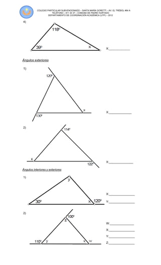 Este documento es una guía de ángulos para el sexto año básico. Contiene ejercicios para calcular medidas de ángulos en triángulos, cuadriláteros y polígonos usando las propiedades de la suma de ángulos interiores y exteriores. Los estudiantes deben mostrar los cálculos para determinar medidas de ángulos desconocidos. También incluye instrucciones para calcular medidas de ángulos interiores en polígonos formando triángulos a partir de un vértice y usando la suma de 180°