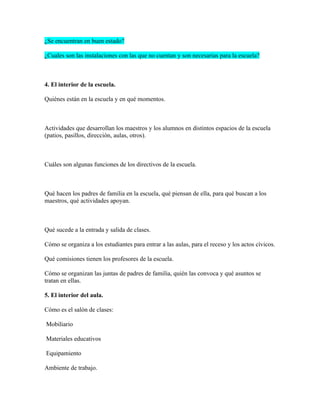 Este documento proporciona una guía de observación para evaluar una escuela secundaria con especialidad en matemáticas. Incluye secciones para recopilar información sobre la escuela, el edificio, las aulas, los maestros y los estudiantes. Se pide detalles sobre la infraestructura, el horario escolar, las actividades de enseñanza, las relaciones entre maestros y estudiantes, y los intereses y opiniones de los estudiantes. El objetivo es obtener una comprensión completa de la dinámica y las operaciones de la