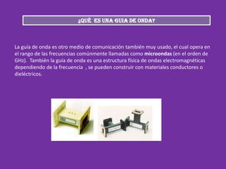 La guía de onda es una estructura física que guía ondas electromagnéticas en el rango de microondas (GHz). Tiene dimensiones de pocos centímetros y puede construirse con materiales conductores o dieléctricos. Los atenuadores son dispositivos que reducen la potencia de una señal de microondas y pueden ser fijos o variables.
