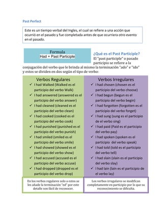 El documento describe el uso del tiempo verbal 'past perfect' en inglés, que se refiere a acciones completadas antes de otro evento en el pasado. Se menciona la fórmula 'had + past participle' y se distingue entre verbos regulares, que terminan en 'ed', e irregulares, que tienen formas variadas. Se proporcionan ejemplos de oraciones para ilustrar su uso en contextos prácticos.