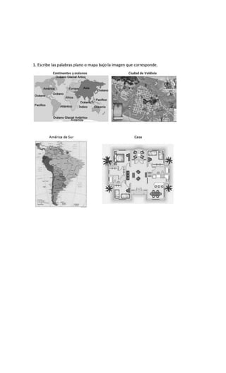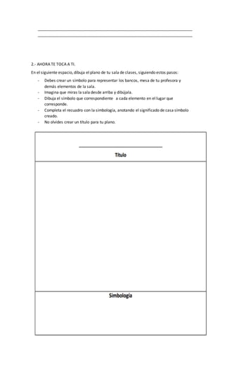 Este documento presenta un objetivo de aprendizaje sobre la lectura y dibujo de planos simples. Explica que los estudiantes deben observar un plano de ejemplo y responder preguntas sobre la capacidad de la sala, la ubicación de la mesa del profesor y la pizarra. Luego, los estudiantes deben dibujar el plano de su propia sala de clases usando símbolos para los bancos, mesa y otros elementos, y explicar la simbología utilizada.