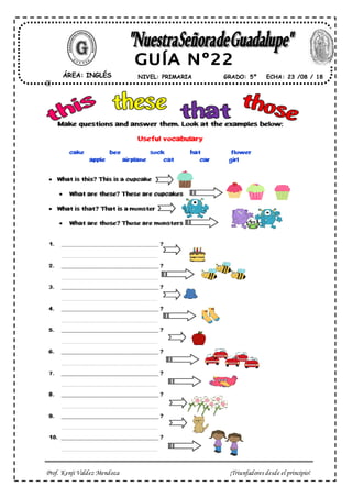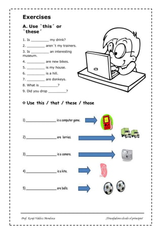 El documento ofrece consejos para el uso de los pronombres demostrativos "este/ese/estos/esos" en inglés para estudiantes de quinto grado de primaria. Les dice que sean triunfadores desde el principio al usar correctamente estos pronombres.