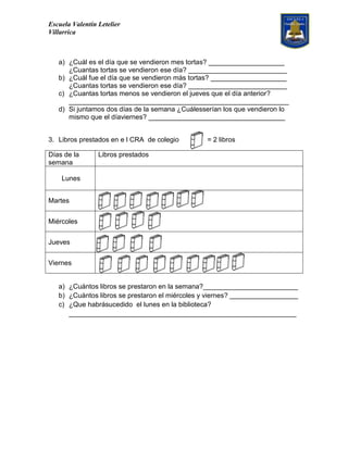 Este documento presenta tres problemas de matemáticas con preguntas sobre stickers entregados a estudiantes, tortas vendidas en una pastelería durante la semana y libros prestados en una biblioteca escolar. Los problemas incluyen tablas con datos numéricos y preguntas sobre identificar el mayor número, sumar cantidades, comparar días y realizar cálculos sencillos.