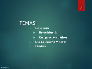 Este documento proporciona una introducción a los componentes básicos de una computadora, incluido el teclado, el ratón, el sistema operativo Windows y el explorador de archivos. Explica la historia breve de las computadoras y describe cada parte del hardware y software, así como cómo realizar tareas básicas como crear carpetas y mover archivos.