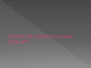 Este documento contiene varias guías sobre gestión de talento humano. Explica los objetivos organizacionales e individuales, el concepto de gestión de talento humano, la cultura organizacional y métodos de análisis y diseño de cargos. También cubre temas como la provisión de recursos humanos, la evaluación del desempeño, las retribuciones, los planes de beneficios, la retención y ruptura laboral, la gestión del conocimiento y el equilibrio entre el trabajo y la familia.