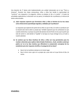 El documento resume dos situaciones relacionadas con la enseñanza de conceptos astronómicos en educación básica. La primera situación espera que los estudiantes expliquen que el día y la noche se producen debido a la rotación de la Tierra sobre su eje, presentando cuando está de día la Tierra está de frente al Sol y de noche le da la espalda. La segunda situación se enfoca en eclipses, explicando que estos ocurren cuando la Luna está entre la Tierra y el Sol, bloqueando parcial o totalmente a uno u otro, y que actividades experimentales e