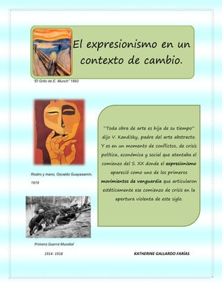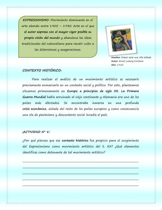 El documento resume el contexto histórico y características del movimiento expresionista en el arte alemán a principios del siglo XX. 1) Surgió en Alemania como reflejo de la crisis política, económica y social posterior a la Primera Guerra Mundial y la depresión. 2) Se caracterizó por distorsionar formas y usar colores intensos para transmitir fuerza psicológica y emociones. 3) Sus principales exponentes fueron Munch, Kirchner y Marc, quienes plasmaron en sus obras la angustia y conf