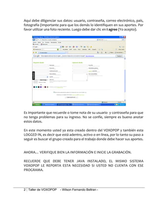 Este documento proporciona instrucciones detalladas para participar en un taller de audioforo usando la plataforma Voxopop. Las instrucciones incluyen cómo registrarse en el sitio web, grabar y enviar un mensaje de audio, y navegar entre los mensajes de audio de otros participantes. El objetivo es crear una cadena de contribuciones de audio interesantes de los compañeros sobre el tema del taller.