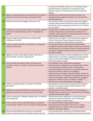 Este documento proporciona 40 instrucciones para realizar diferentes tareas en Microsoft Word como agregar comentarios, ordenar tablas, modificar estilos, insertar tablas, aplicar formatos y más. Cada instrucción incluye una explicación detallada de los pasos a seguir para completar la tarea solicitada utilizando las herramientas y opciones disponibles en Word.