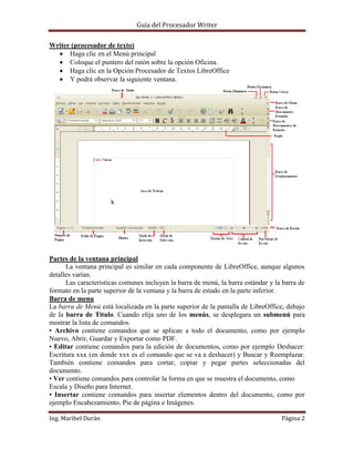 El documento proporciona información sobre el software LibreOffice. LibreOffice incluye componentes como Writer (procesador de texto), Calc (hoja de cálculo), e Impress (presentaciones). Writer permite crear documentos y puede exportar archivos a varios formatos. Calc incluye funciones para análisis financieros y estadísticos. Impress proporciona herramientas para presentaciones multimedia.