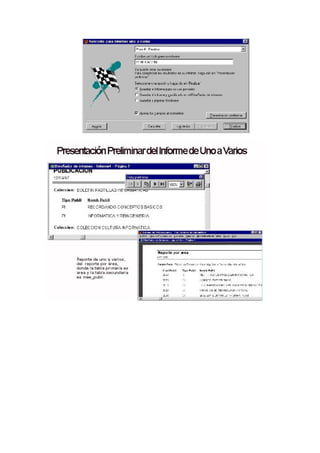 Este documento presenta una guía de autoaprendizaje para Visual FoxPro. Incluye capítulos sobre cómo crear un proyecto de aplicación, incluyendo una base de datos, tablas, formularios, consultas, reportes y menús. También explica conceptos básicos como campos, registros, archivos, claves y bases de datos. El proyecto de ejemplo es un sistema de control de publicaciones del INEI.