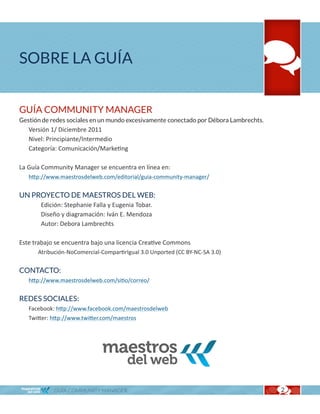 Este documento presenta una guía sobre el rol de Community Manager. Explica que un CM se encarga de cuidar y mantener la comunidad de seguidores de una marca en redes sociales, actuando como enlace entre las necesidades de los usuarios y la empresa. Además, define conceptos clave como Community Manager, comunidades online y redes sociales. Finalmente, incluye una infografía sobre los estereotipos sobre el trabajo de un CM.