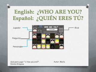 Este documento presenta una guía para jugar el videojuego "¿Quién eres tú?". Explica que el objetivo del juego es adivinar el personaje del rival antes de que él adivine el tuyo. Detalla las instrucciones como seleccionar un nivel de dificultad, hacer preguntas, descartar opciones, y resolver. También cubre los modos de juego, autoevaluación, y actividades de comprobación sugeridas. El documento fue creado por María Estela Oropeza como recurso educativo.