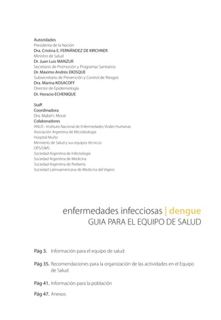 Este documento presenta información sobre el diagnóstico y manejo del dengue para equipos de salud. Explica que el dengue es causado por un virus transmitido por mosquitos Aedes y puede manifestarse de forma leve o grave. Describe los síntomas y etapas de la enfermedad, así como recomendaciones para la detección, confirmación, tratamiento y notificación de casos. También incluye lineamientos para la organización de actividades preventivas en equipos de salud y para brindar información a la población sobre la prevención del dengue.