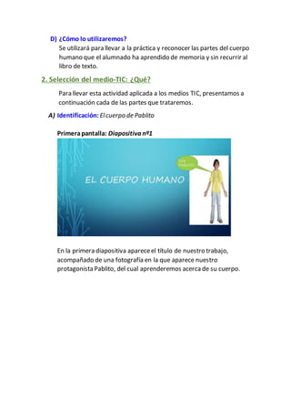 Este documento presenta una guía didáctica para enseñar a estudiantes de 5o grado los huesos del cuerpo humano a través de medios TIC. La guía incluye objetivos, contenidos y actividades. Se utilizará una presentación con diapositivas que muestra los huesos, sus funciones y tipos. También incluye videos musicales y ejercicios prácticos de identificación de huesos. El propósito es que los estudiantes adquieran conocimientos sobre el cuerpo humano de manera interactiva y entreten