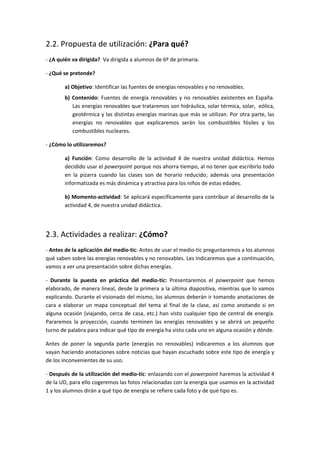 Este documento presenta una guía didáctica para el uso de una presentación en PowerPoint sobre las fuentes de energía en España. La presentación constará de diferentes plantillas para explicar las energías renovables (hidráulica, solar térmica, solar, eólica, geotérmica y marina) y no renovables (combustibles fósiles y nucleares). Se utilizará en una clase de 6o primaria para identificar estas fuentes de energía como parte de la actividad 4 de su unidad didáctica.