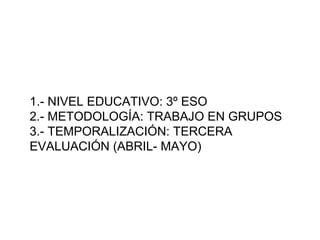 Este documento proporciona detalles sobre una evaluación para estudiantes de 3o de ESO. Se llevará a cabo durante la tercera evaluación de abril a mayo y utilizará un método de trabajo en grupos.