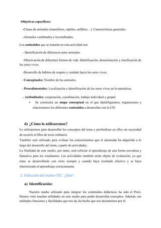 Este documento presenta una guía didáctica para enseñar sobre el reino animal a niños de 7-8 años utilizando Prezi. La guía explica que el medio se utilizará para desarrollar conceptos sobre los animales vertebrados e invertebrados de manera dinámica e interactiva, incluyendo videos y actividades. Antes, durante y después de la presentación, los estudiantes completarán tareas como lluvias de ideas, clasificación de animales y emparejamiento de imágenes con nombres. La guía también incluye referencias