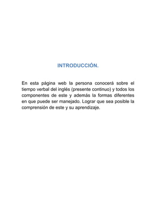 Este documento proporciona información sobre el tiempo presente continuo (present progressive o present continuous) en inglés. Explica la estructura, formas y reglas ortográficas de este tiempo verbal, acompañado de ejemplos. Además, incluye objetivos, competencias y metodología para el aprendizaje del tema, así como dos lecciones y una actividad de ejercitación.