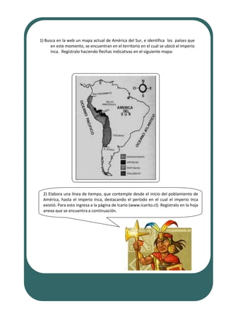 Este documento presenta una guía didáctica sobre la civilización inca. Propone como objetivo reconocer la ubicación geográfica del Imperio Inca y representar cronológicamente en una línea de tiempo los eventos desde el pre-imperio inca hasta su extinción. Los estudiantes deben agruparse, buscar información, responder preguntas brevemente y compartir con el curso.