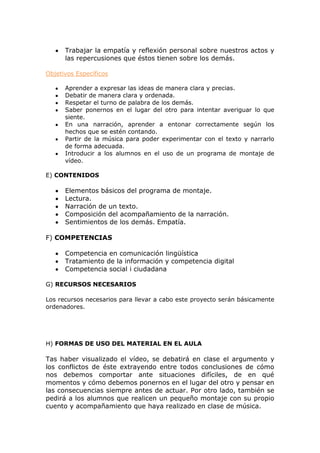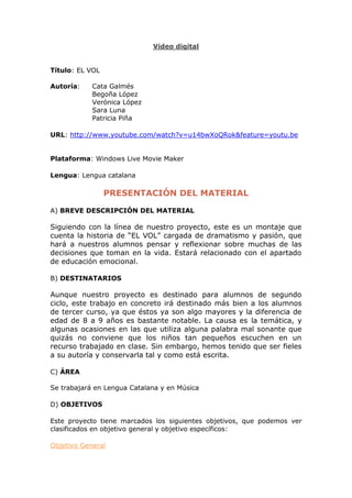Este documento presenta un video titulado "EL VOL" creado por un grupo de estudiantes. El video cuenta la historia de forma dramática y apasionada para hacer que los estudiantes reflexionen sobre las decisiones que toman. El video está destinado a estudiantes de tercer curso y más para tratar temas emocionales. Los objetivos son trabajar la empatía, expresar ideas claramente y respetar los turnos de palabra. El video utiliza un programa de edición para combinar la lectura, narración y música. Después de verlo, los estud