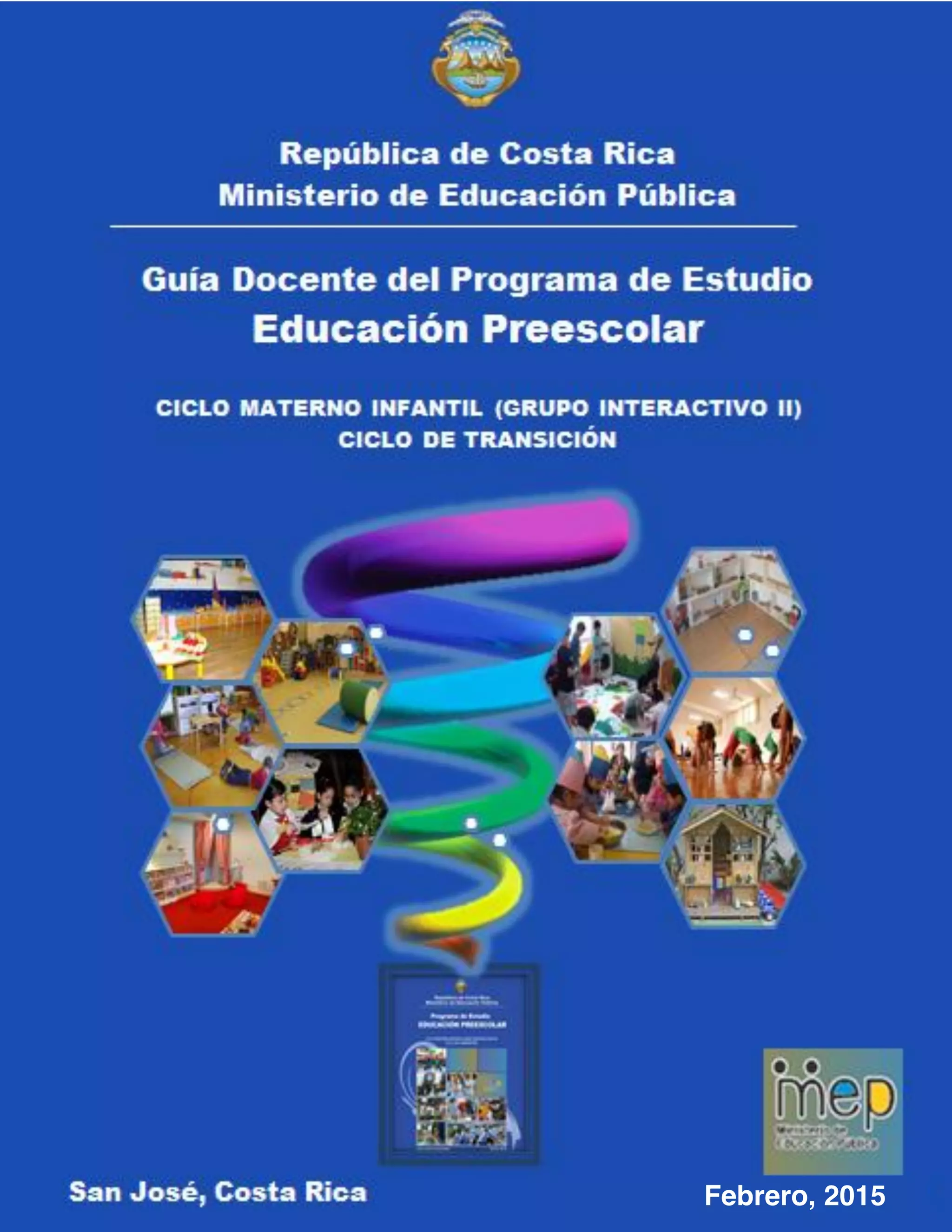 Este documento presenta una guía docente para el programa de estudio de Educación Preescolar en Costa Rica. La guía incluye orientaciones pedagógicas y didácticas para organizar los elementos curriculares de manera que promuevan el desarrollo exitoso de los niños. La guía aborda aspectos como la metodología activa, el planeamiento, la evaluación de aprendizajes, los ambientes de aprendizaje, la organización del tiempo, el seguimiento individualizado de los niños y la articulación con otros niveles educativos.