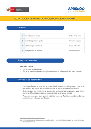 Este documento presenta la guía docente para la programación semanal del 30 de junio al 3 de julio. El objetivo es que los estudiantes reconozcan y expresen sus emociones a partir de situaciones cotidianas. Durante la semana, identificarán emociones como el miedo, la molestia y la tristeza, y aprenderán técnicas como la respiración y el yoga para regular sus emociones. También establecerán acuerdos que les permitan relacionarse con los demás en armonía.