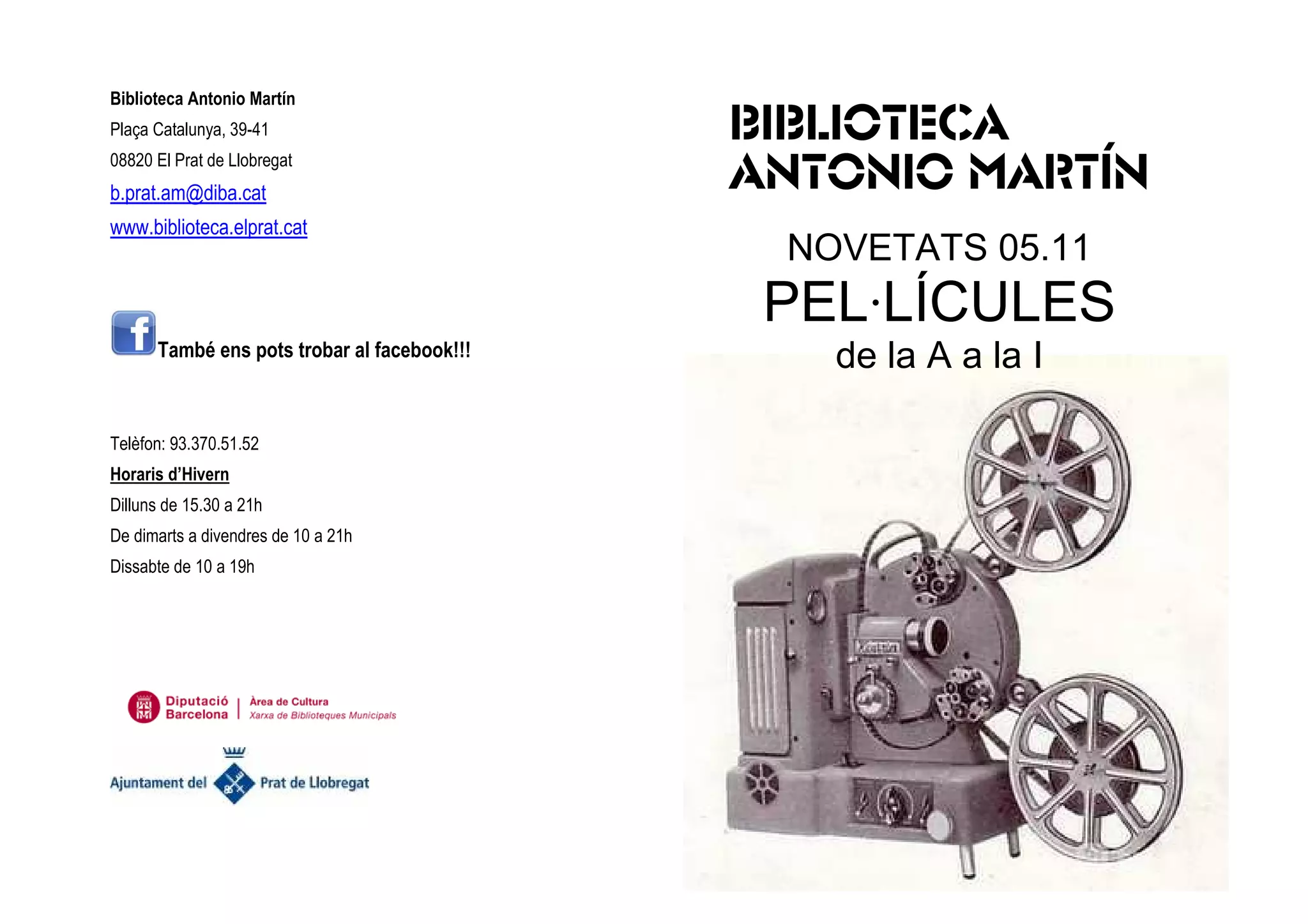 Este documento es un boletín informativo de novedades de películas en la Biblioteca Antonio Martín en El Prat de Llobregat, España. Proporciona detalles de contacto como la dirección, número de teléfono y horarios de la biblioteca. Luego enumera los títulos de películas recientemente adquiridas de la A a la I, incluyendo clásicos de directores como Stanley Kubrick, Akira Kurosawa, Federico Fellini y Tim Burton.