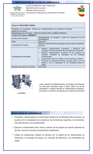 Este documento presenta una guía de aprendizaje para el programa técnico en mantenimiento de equipos de computo de 24 meses de duración. La guía incluye 7 actividades para enseñar el desensamble y ensamble de computadores, monitores, impresoras y fuentes de poder, así como la gestión de residuos y conceptos de ética laboral. El objetivo es que los aprendices adquieran habilidades en el mantenimiento de equipos informáticos y conozcan sobre temas como salud ocupacional, cultura física y sostenibilidad