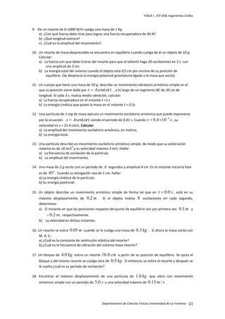 Este documento contiene 17 problemas relacionados con el movimiento armónico simple, ondas mecánicas y sonido. Los problemas cubren temas como calcular constantes elásticas, ecuaciones de movimiento, velocidades, frecuencias y energías asociadas con oscilaciones y ondas.